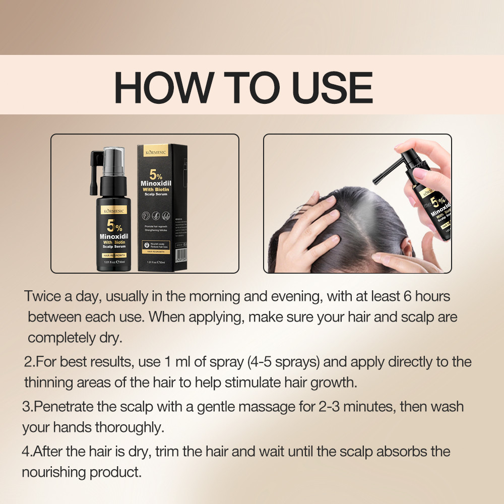 Follow-Up Care: For optimal hair regrowth results, follow up by using the KORMESIC Minoxidil Hair Growth Spray. Apply the spray evenly to dry scalp and gently massage until absorbed. This step enhances hair regrowth, reduces hair loss, and increases hair density.