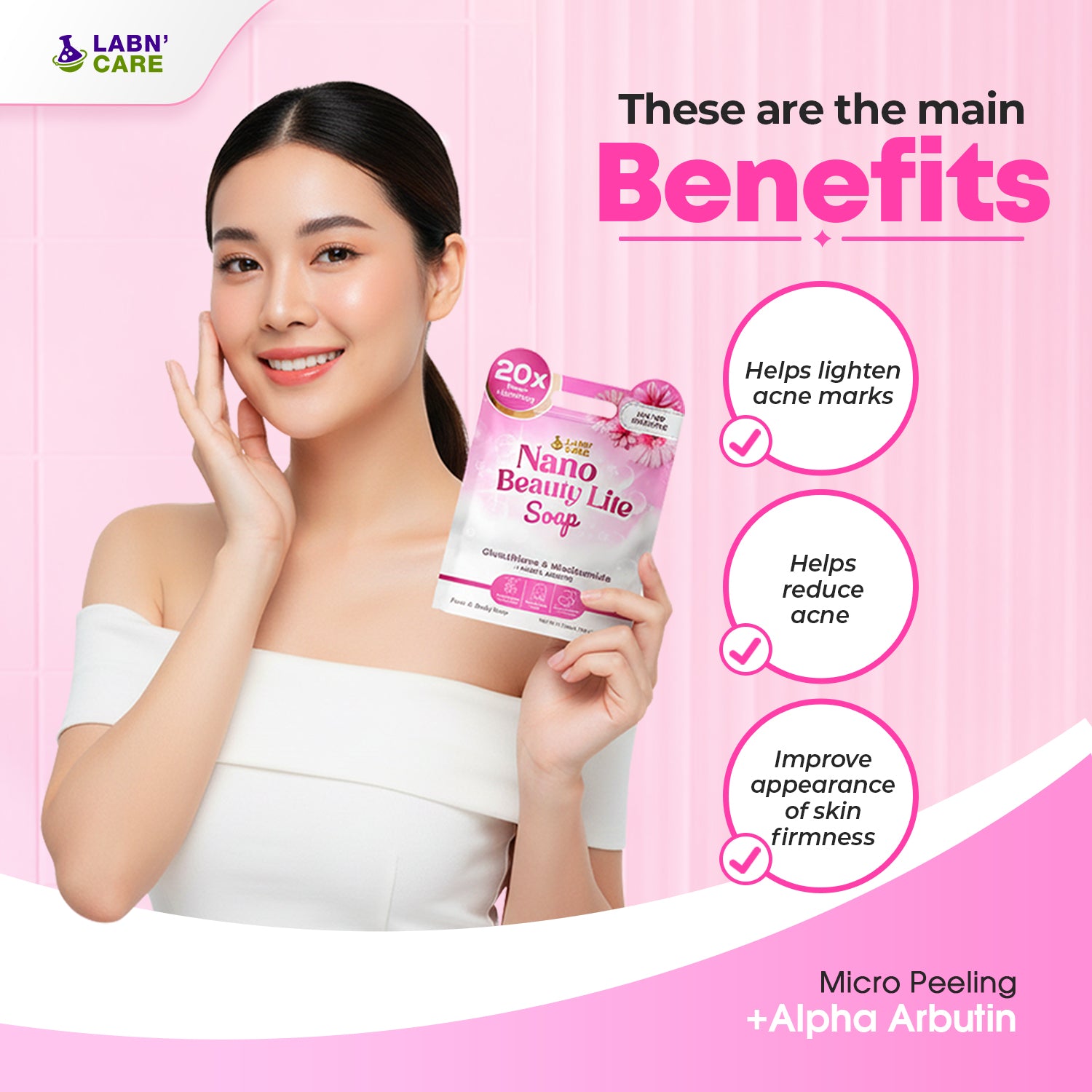 Discover the LABN'CARE NANO BEAUTY LITE SOAP, a powerful solution for your skincare needs. Formulated with Glutathione, Niacinamide, and Alpha Arbutin, this soap offers 20X power for lightening. Perfect for face and body, it's designed to enhance your skin's