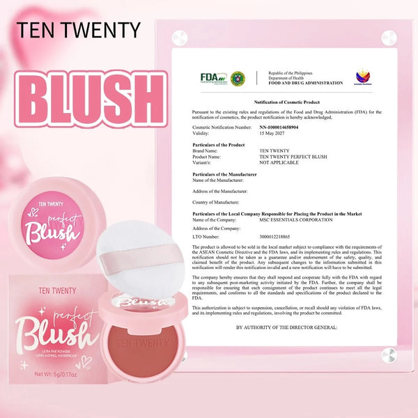 TEN TWENTY BLUSH: Richly pigmented, long lastinghighly and buildable, the beautiful matte and shimmery shades of Blush are the perfect cheeky pop of color for every skin tone. Shape and highlight your best facial features. Highly pigmented, easy to blend, give you a natural looking flush all day.